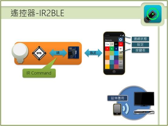 Posted on 2021 年 4 月 1 日2021 年 4 月 1 日 群锋电子推出IR to BLE 遥控器+App方案,轻鬆升级各种传统以红外线控制的家电产品,例如灯具、电视、音响、DVD 播放机等,手机透过蓝芽将控制讯号传送至BLE接收端模组后再 转换为IR讯号传送给家电端,无需另外修改家电功能。